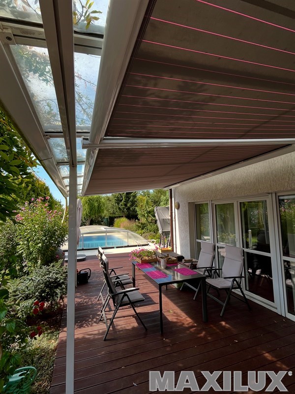 Komfortní hliníkové zastřešení terasy včetně integrované markýzy pod sklem