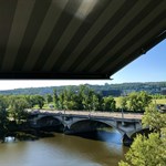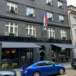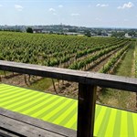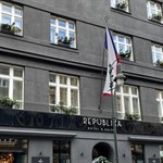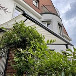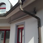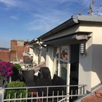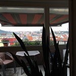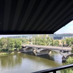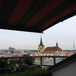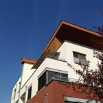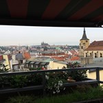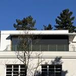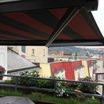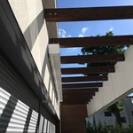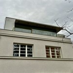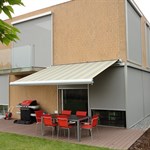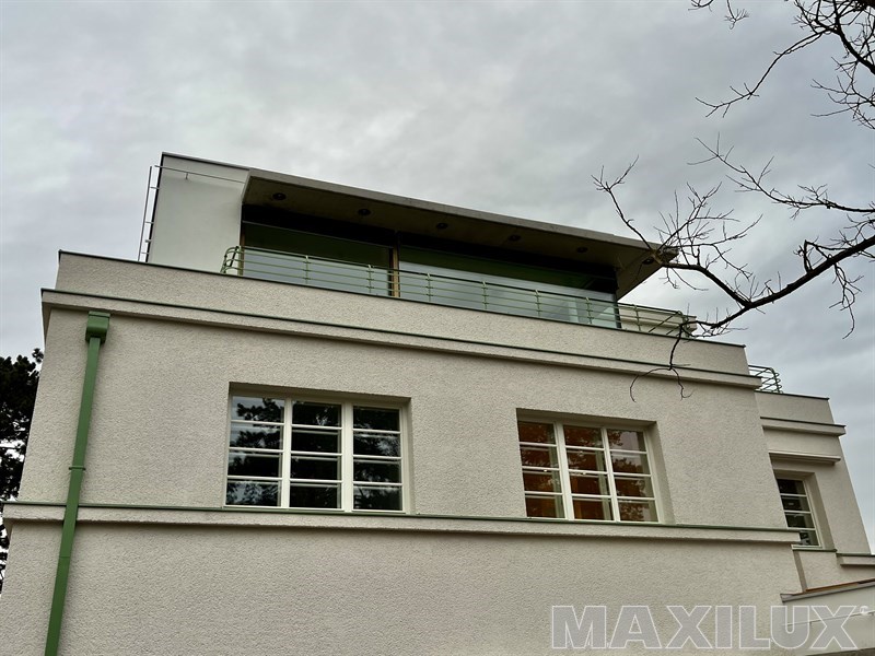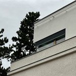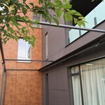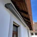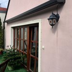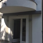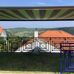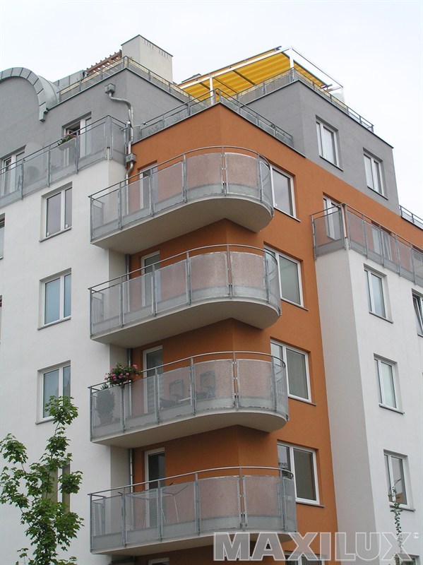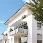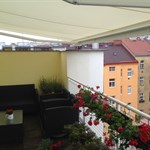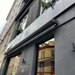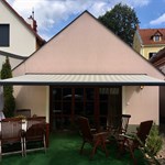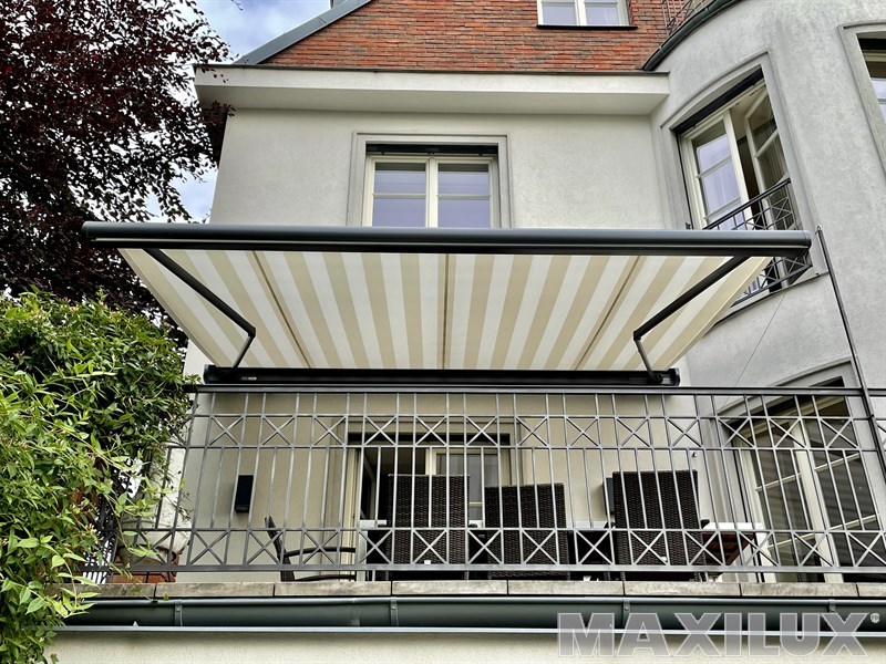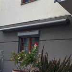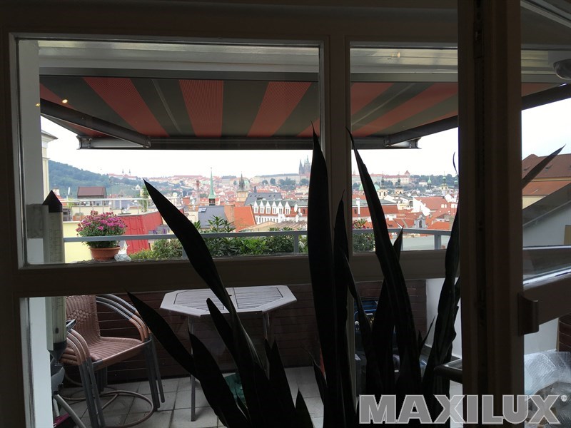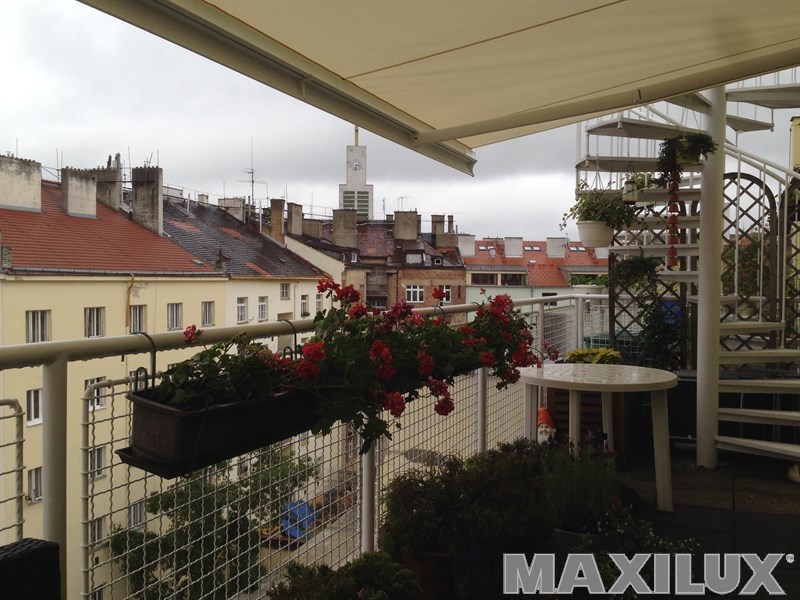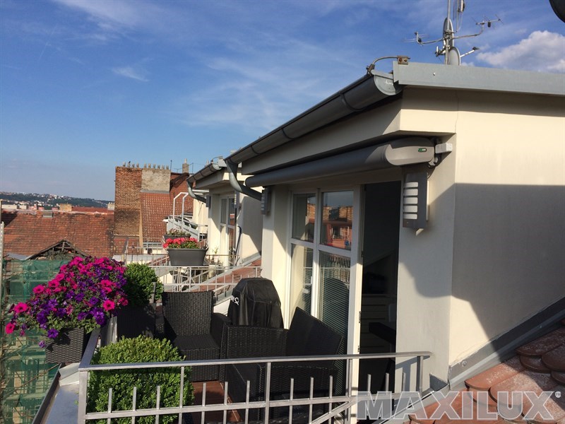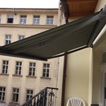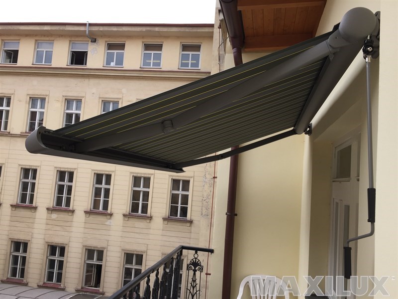 Elegantní výsuvná markýza decentně sladěná s histirickou pavlačí domu.