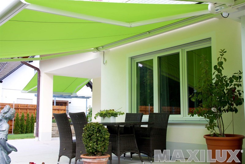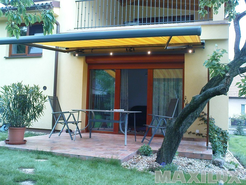 Luxusní velkoprostorová kazetová markýza na dálkové ovládání doplněná o světelnou rampu
