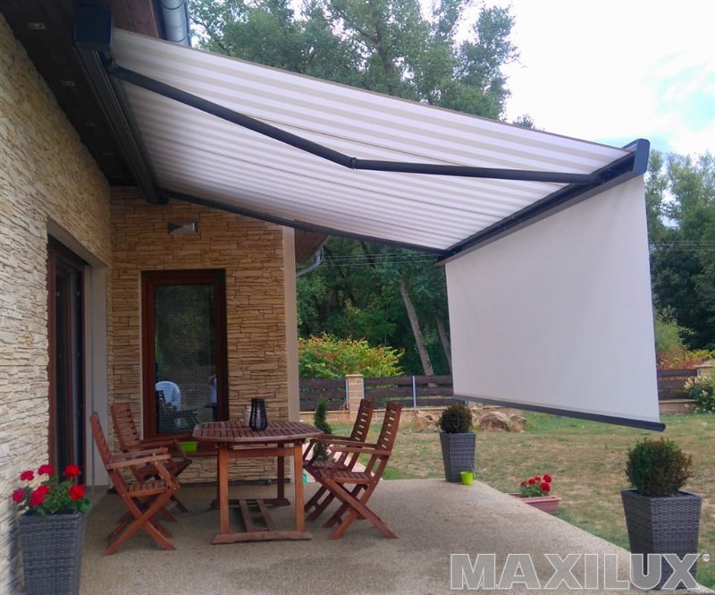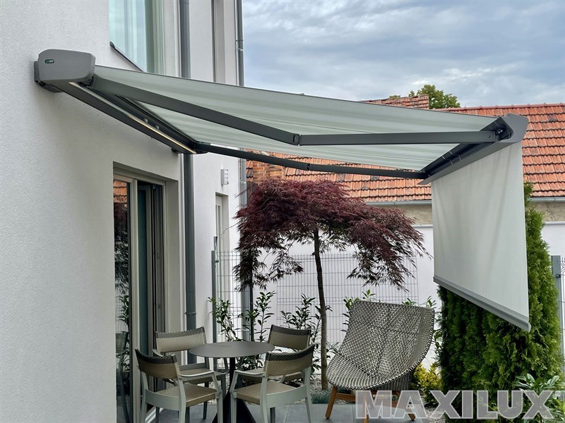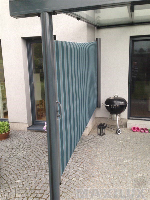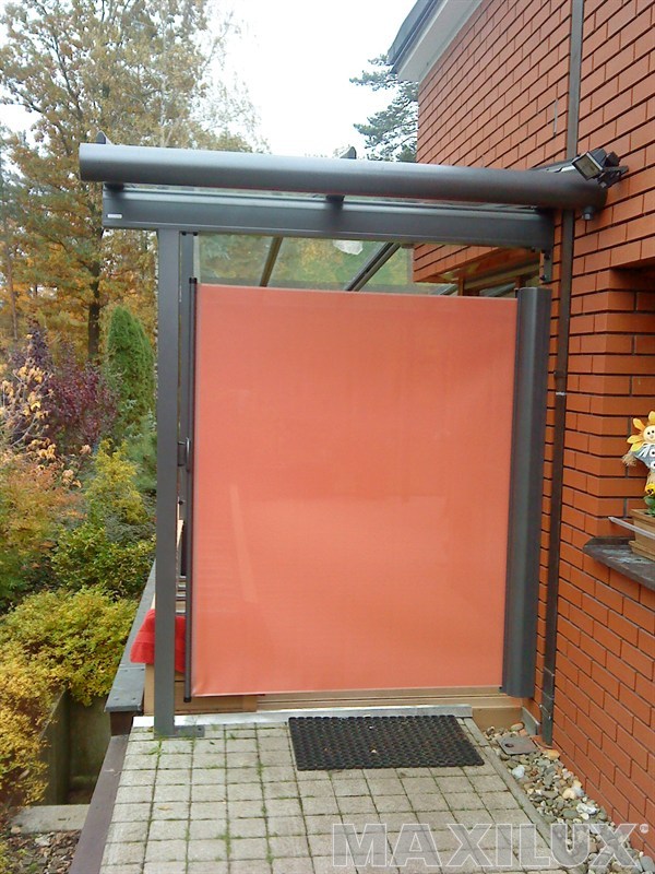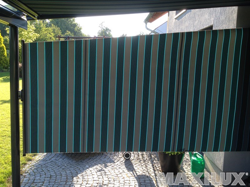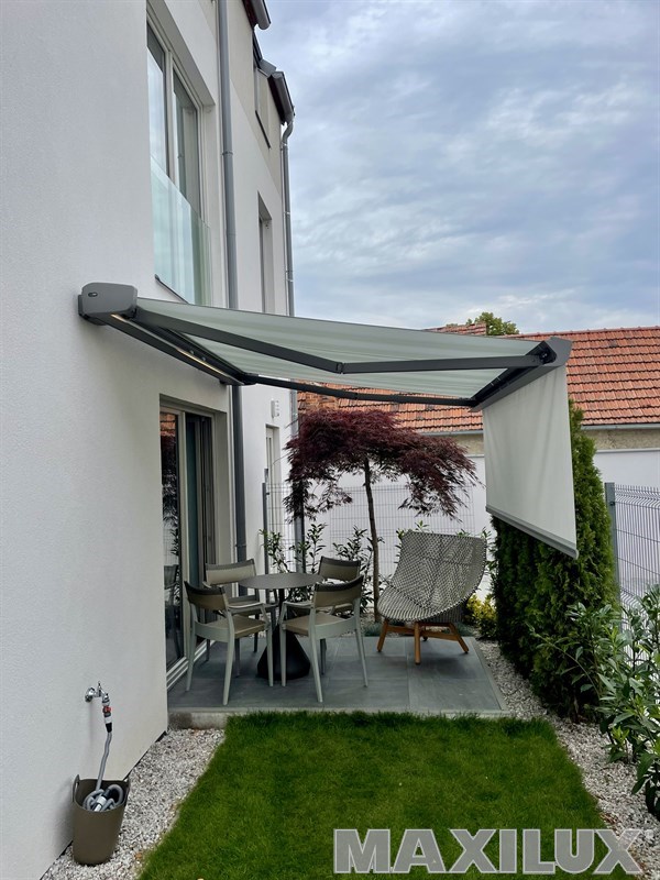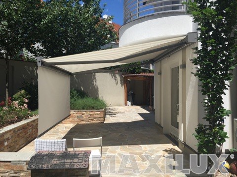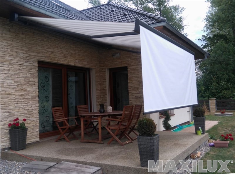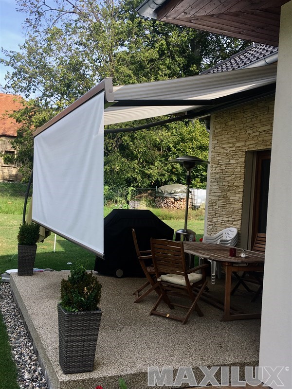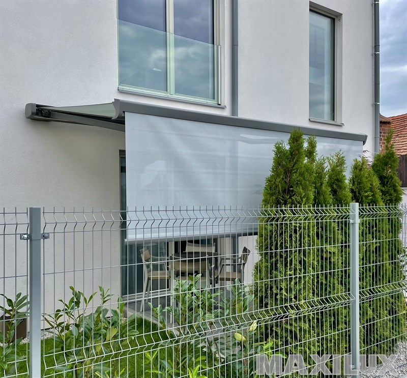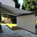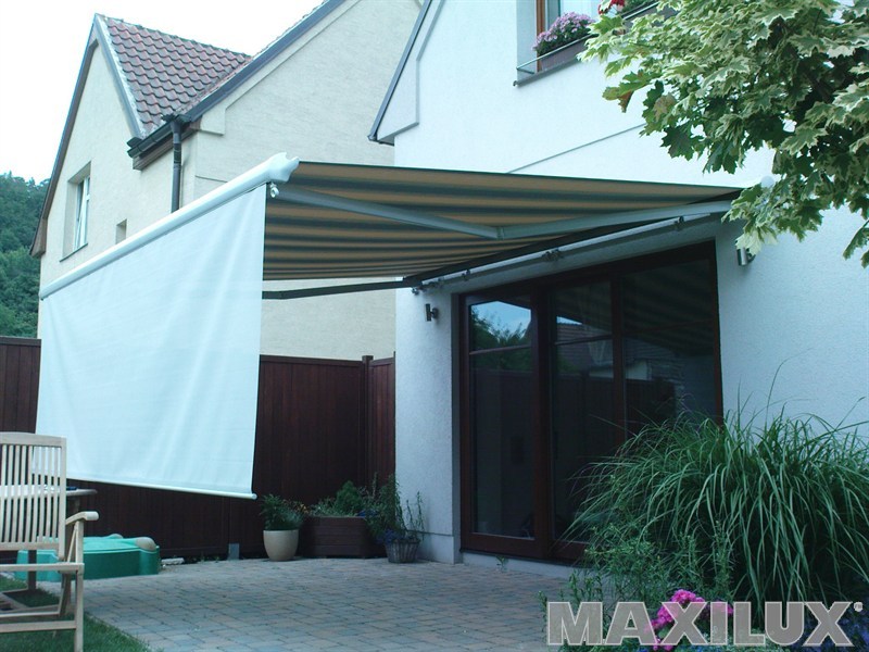 Boční markýza na ruční ovládání rolovací do kazety sladěná s vrchní markýzou