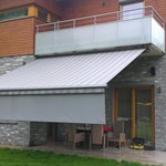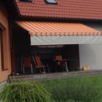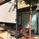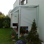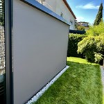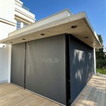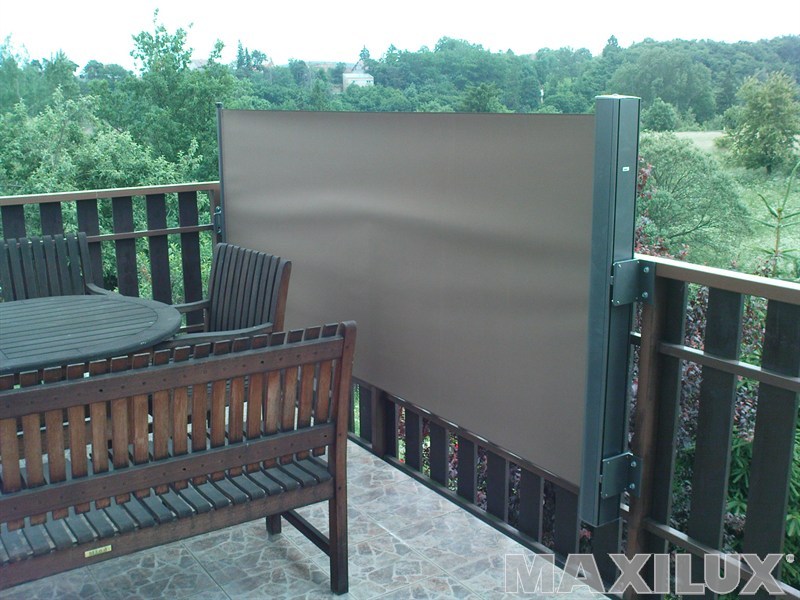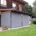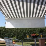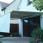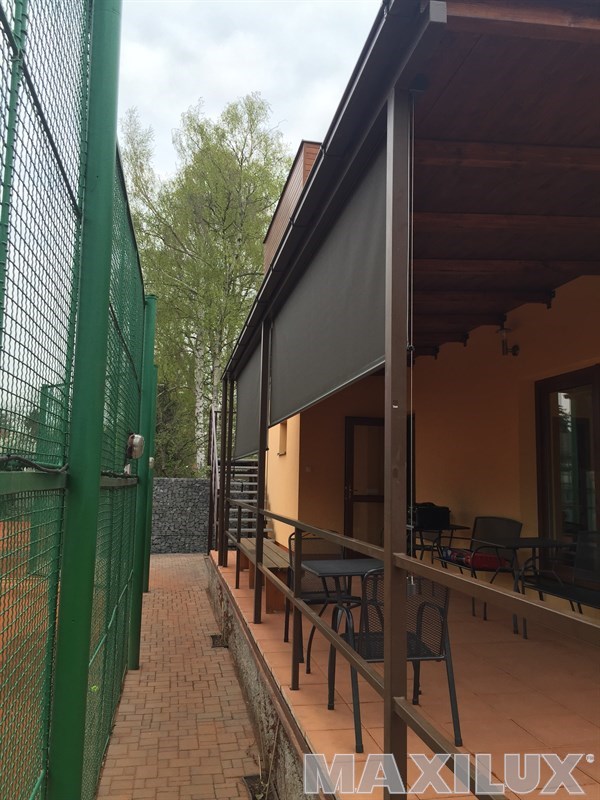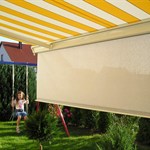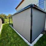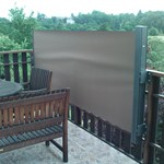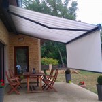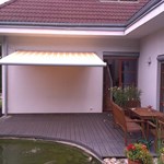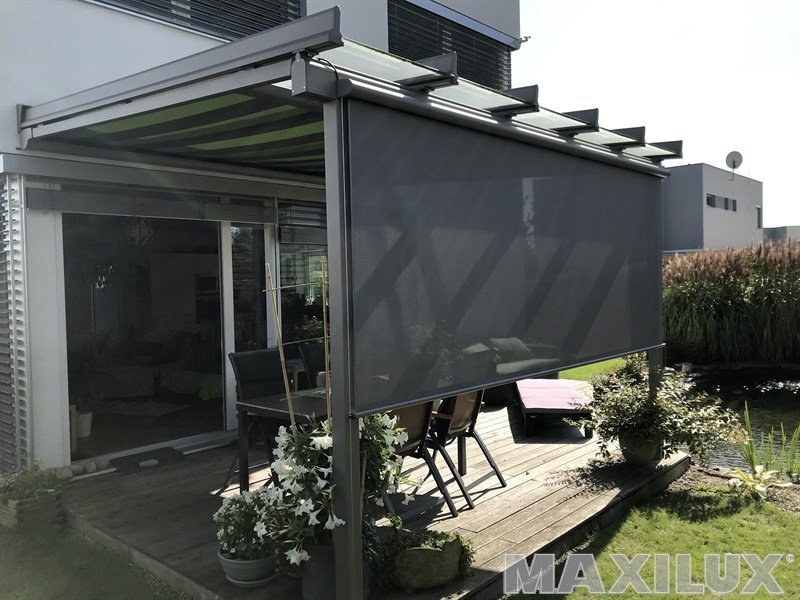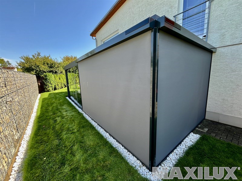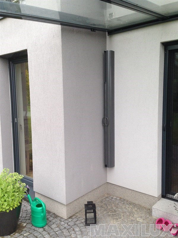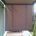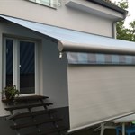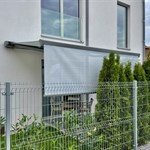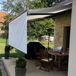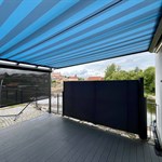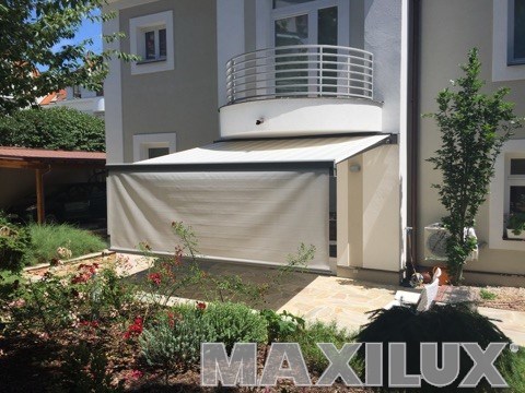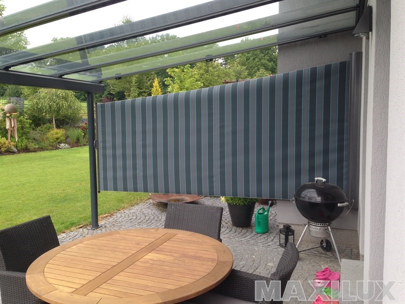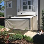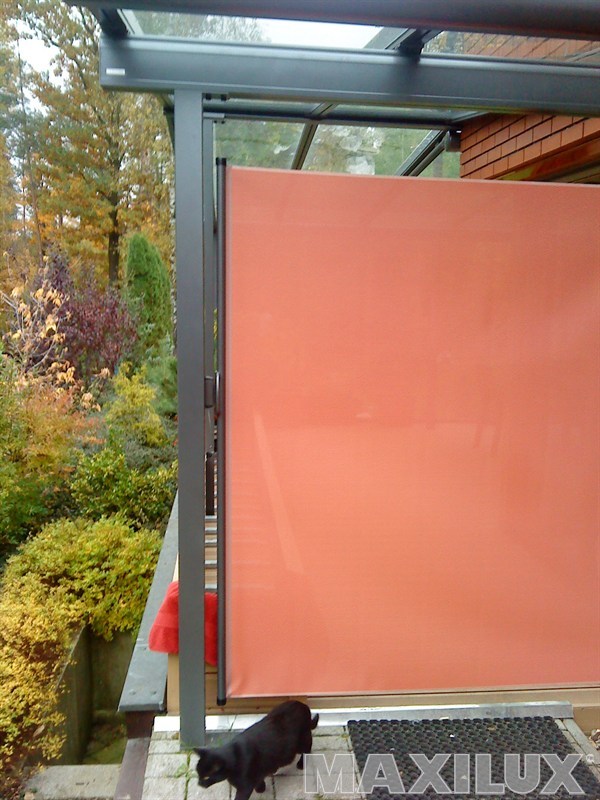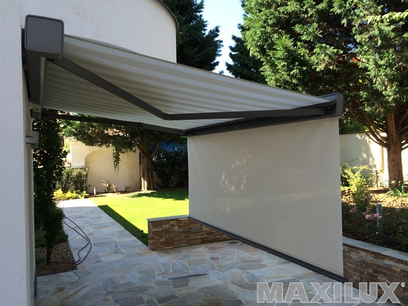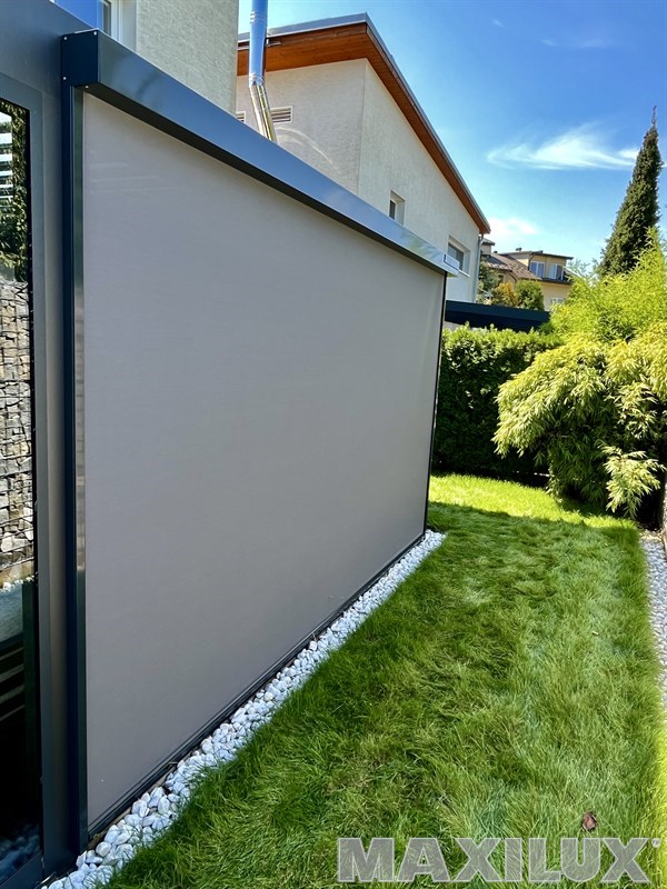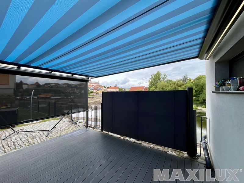 Boční markýza na ruční ovládání rolovací do kazety sladěná s vrchní markýzou