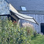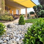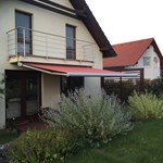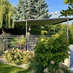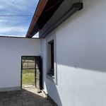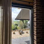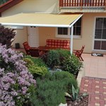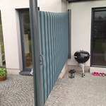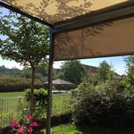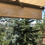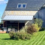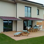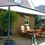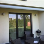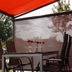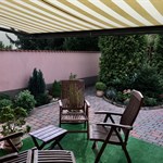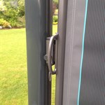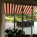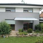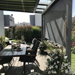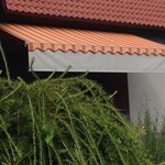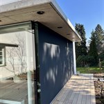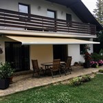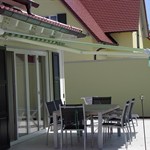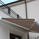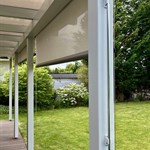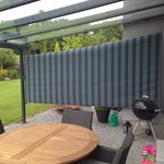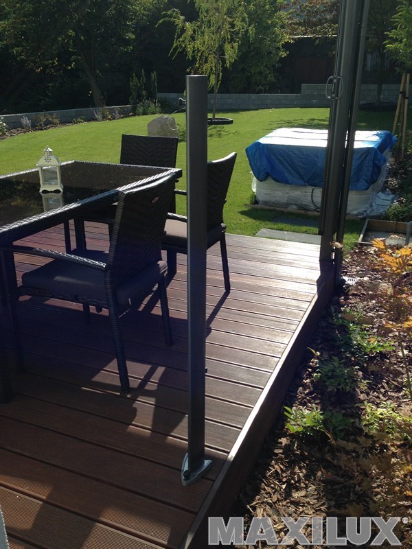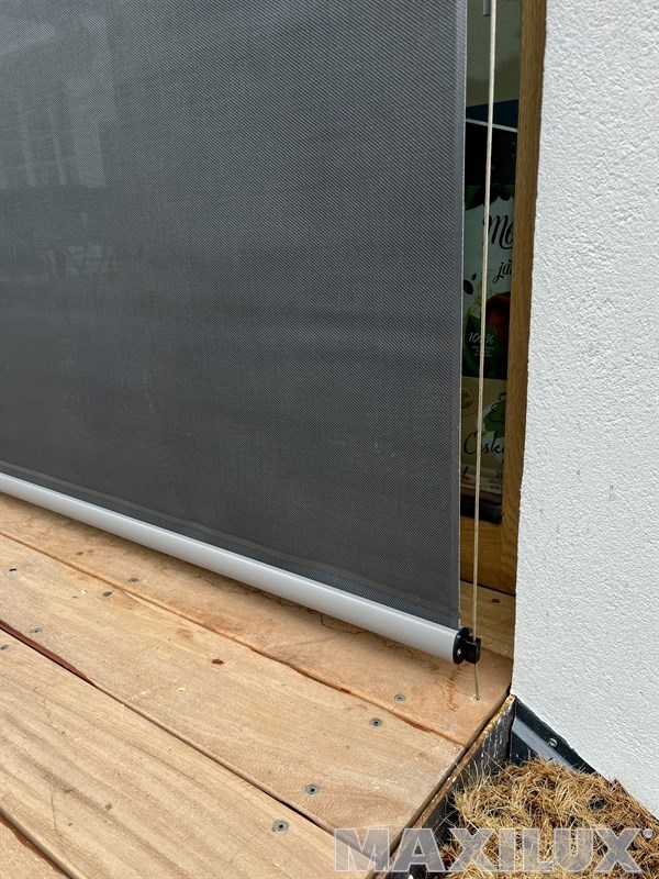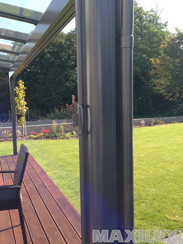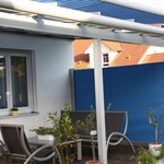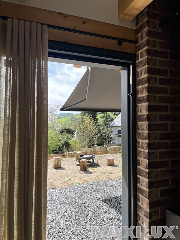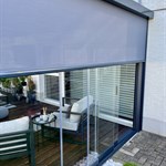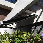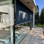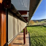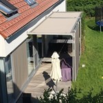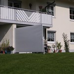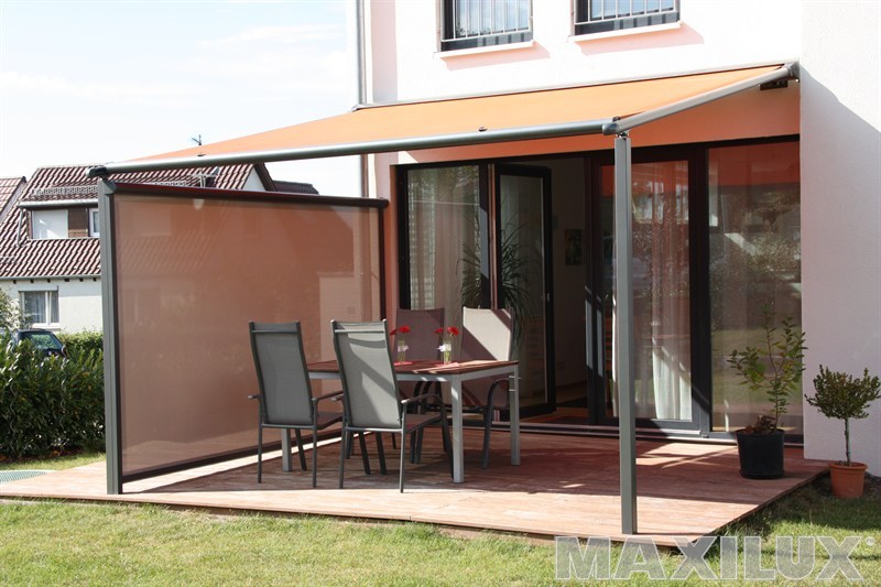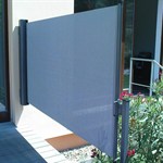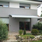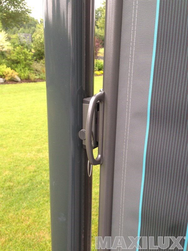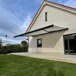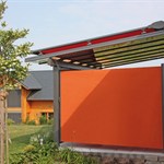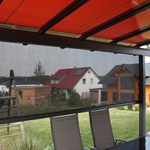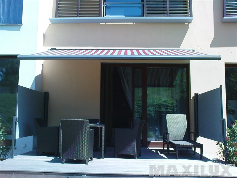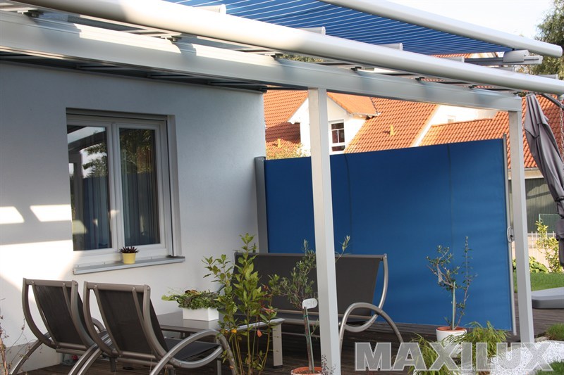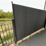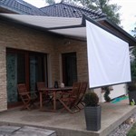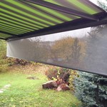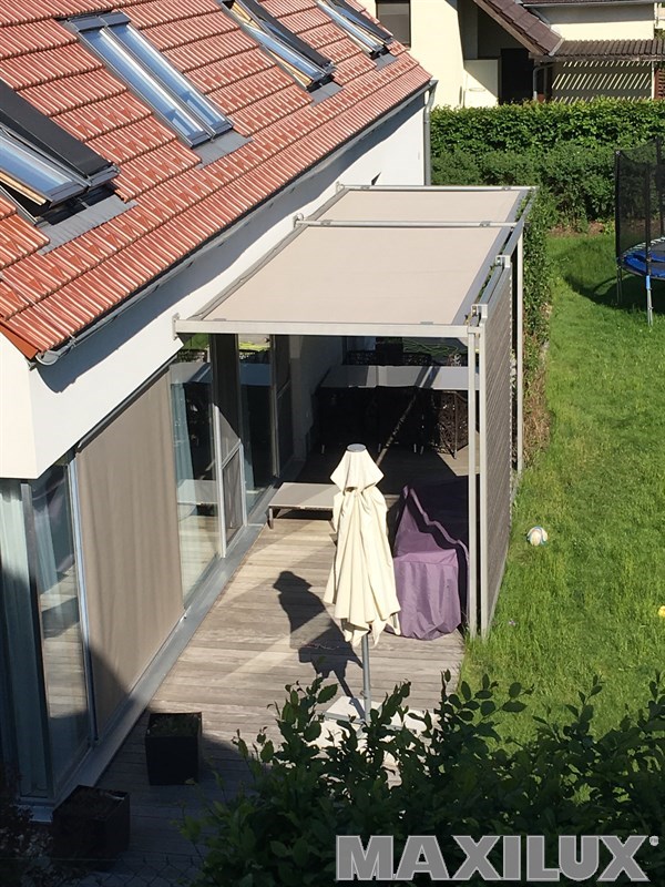 Boční markýza na ruční ovládání rolovací do kazety sladěná s vrchní markýzou