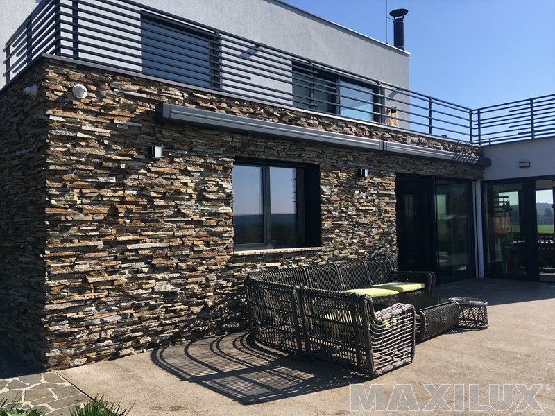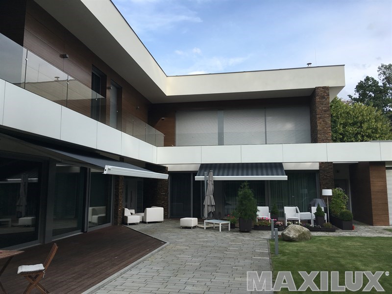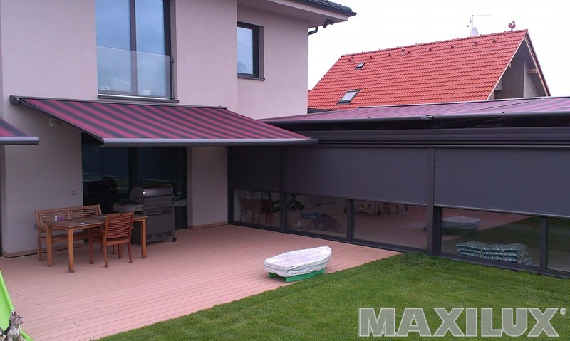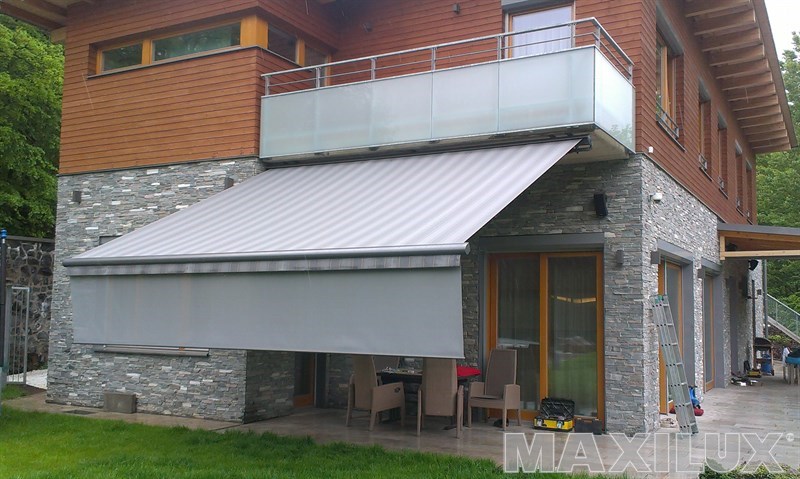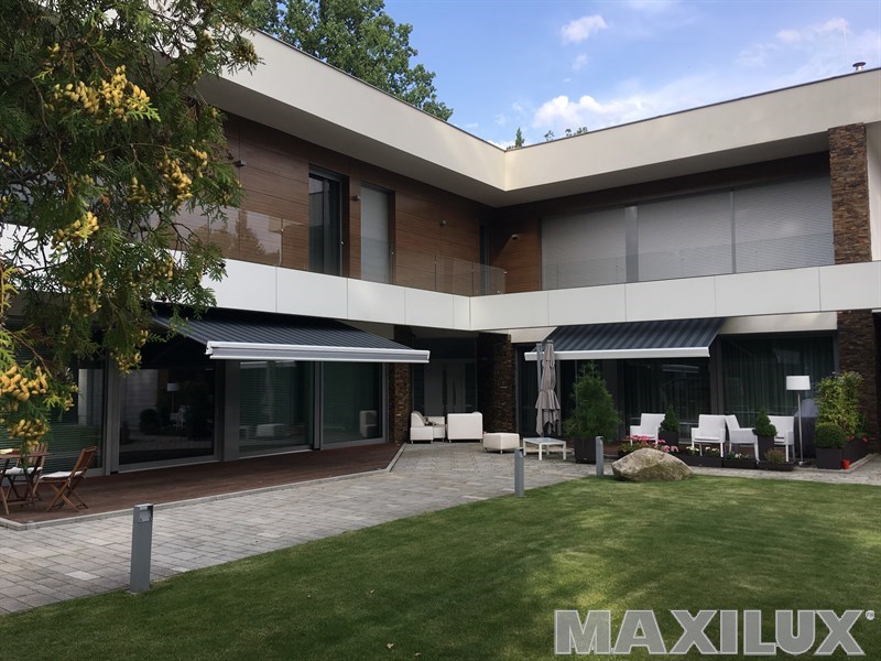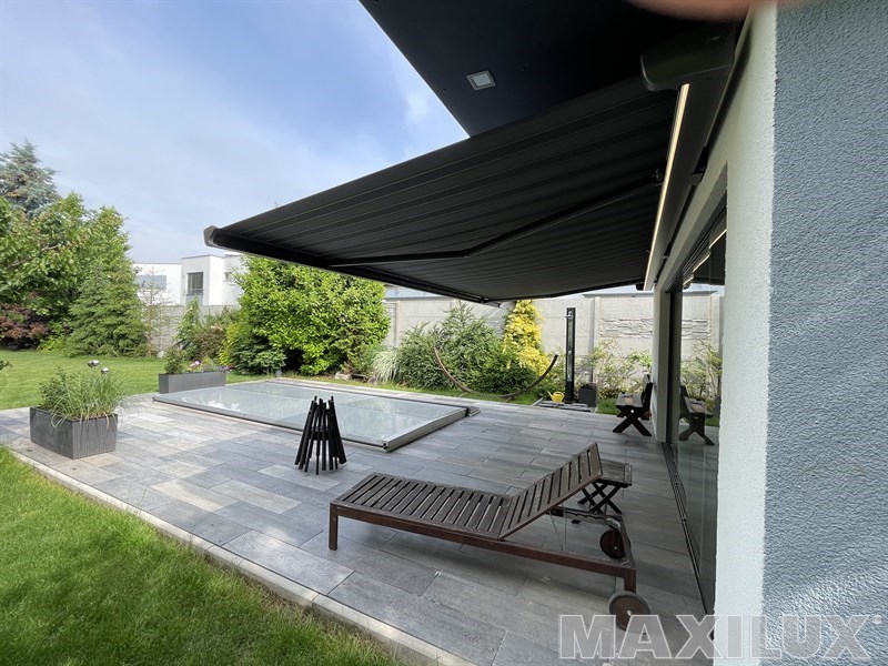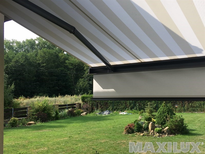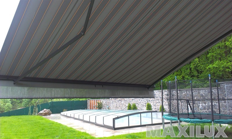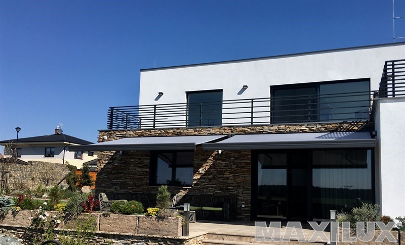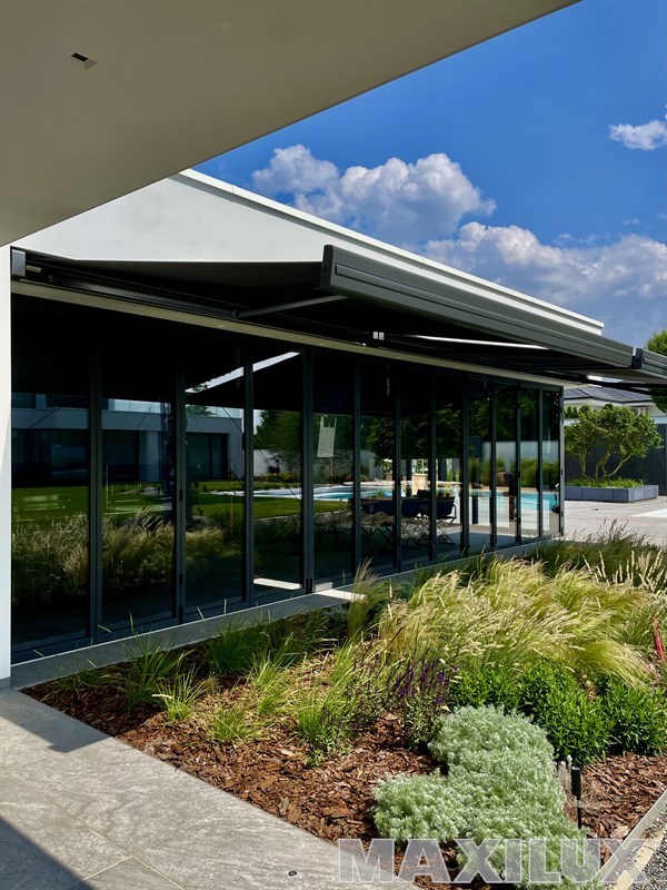 Kazetová velkoprostorová markýza na dálkové ovládání pro velké terasy doplněná o přední markýzu