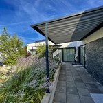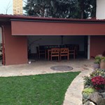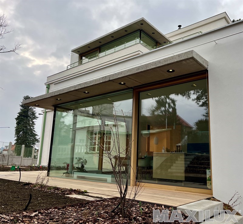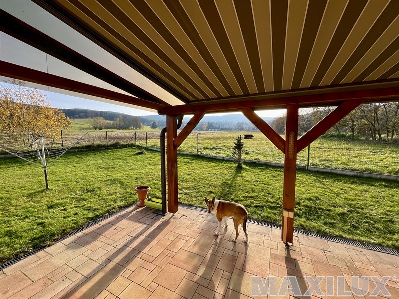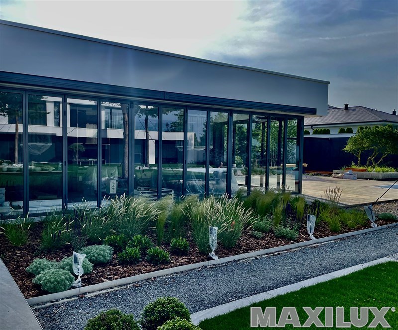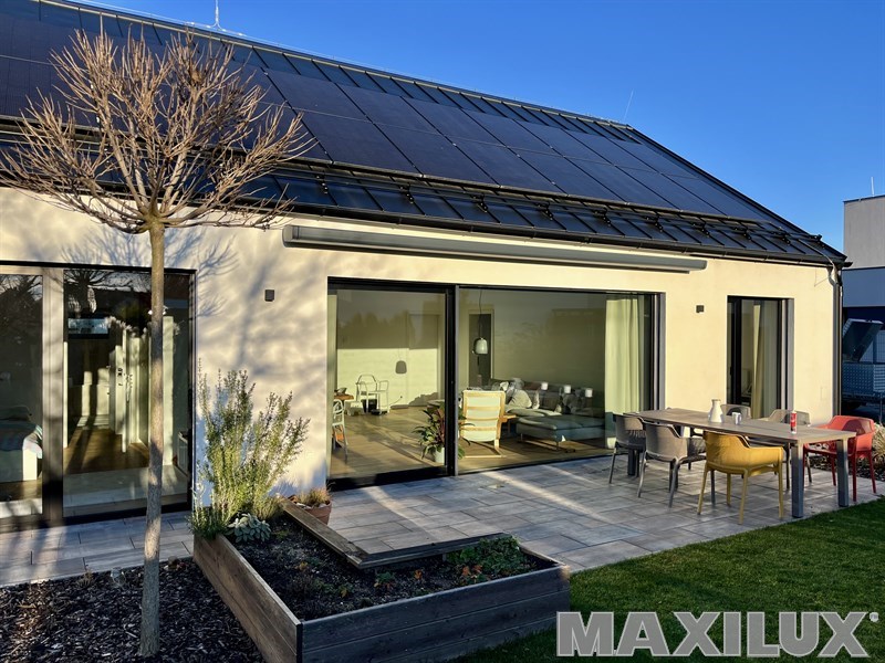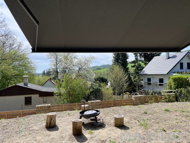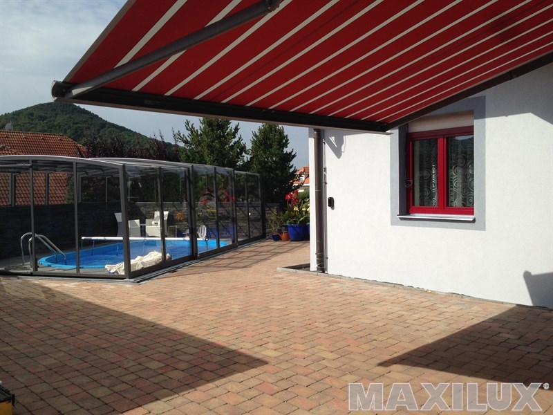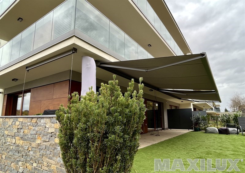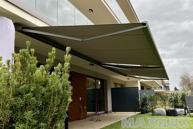 Kazetová velkoprostorová markýza na dálkové ovládání pro velké terasy doplněná o přední markýzu