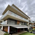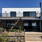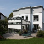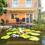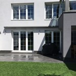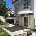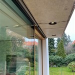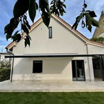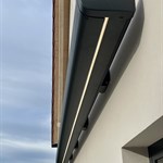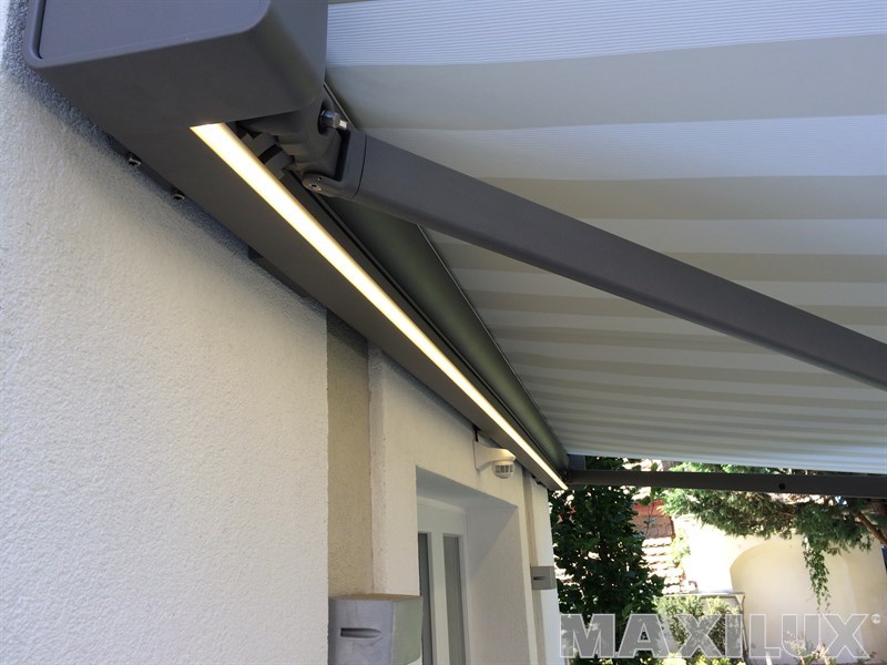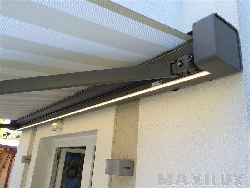 Luxusní designová kazetová čtvercová markýza včetně předního volánu a LED osvětlení na dálkové ovládání integrovaná do fasády domu